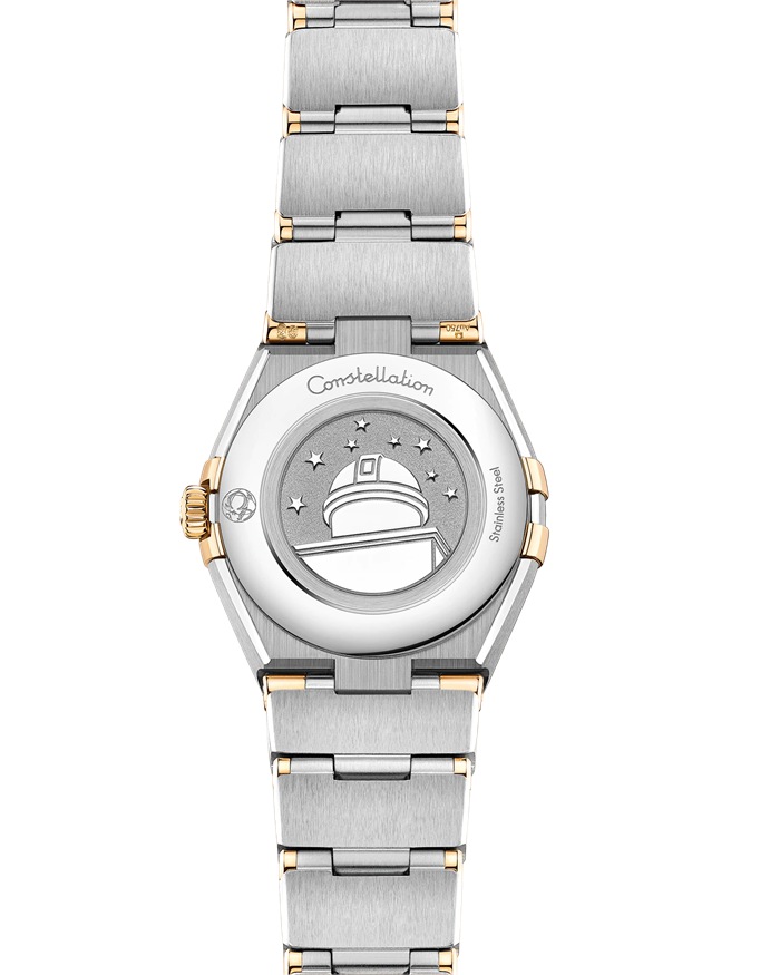Este modelo de 25 mm en oro amarillo de 18 qt y acero noble luce un bisel con números romanos grabados, esfera de nácar blanco y cristal de zafiro resistente al rayado. Las agujas, el logotipo OMEGA, la estrella Constellation y los índices son también de oro amarillo de 18 qt.