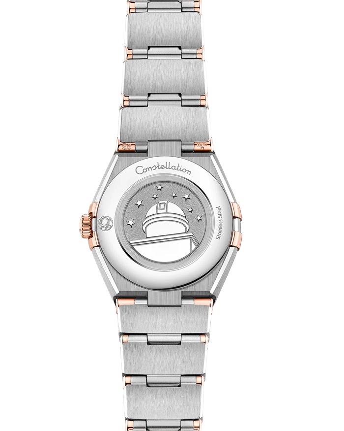 Este modelo de 25 mm en oro Sedna™ de 18 qt y acero noble luce un bisel con números romanos grabados, esfera plateada blanca cristalina y cristal de zafiro resistente al rayado. Las agujas, el logotipo OMEGA, la estrella Constellation y los índices son también de oro Sedna™ de 18 qt.