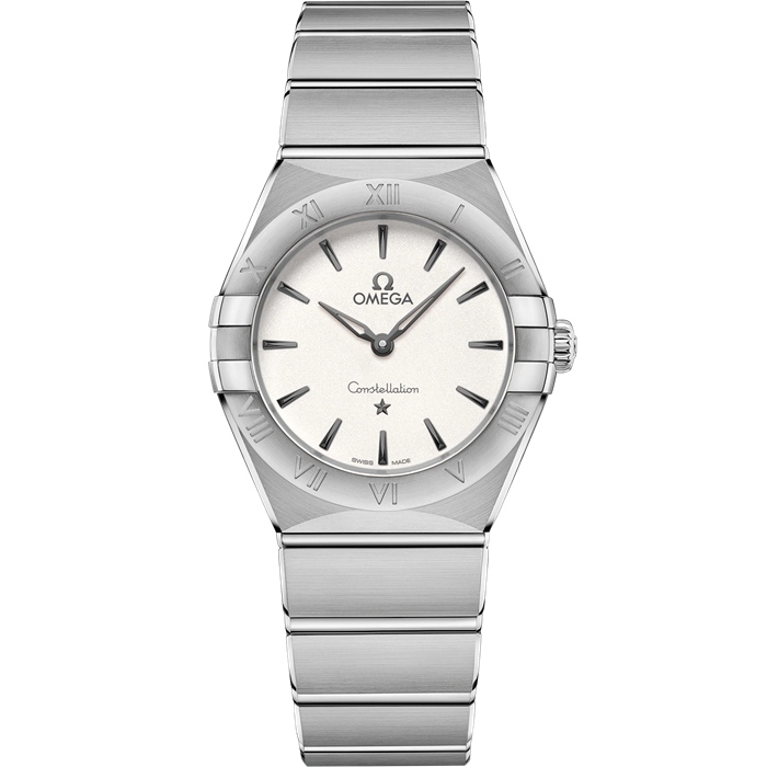 Este modelo de 28 mm en acero noble luce un bisel con números romanos grabados, esfera plateada blanca cristalina y cristal de zafiro resistente al rayado. Las agujas, el logotipo OMEGA, los índices y la estrella Constellation, todos ellos ennegrecidos, forman un bello contraste con la esfera blanca.
