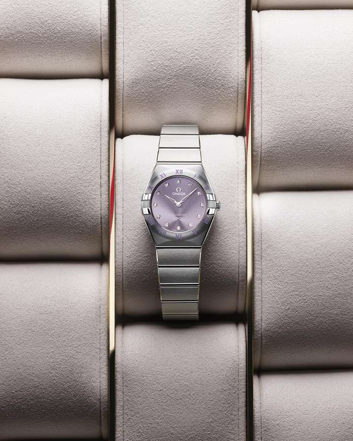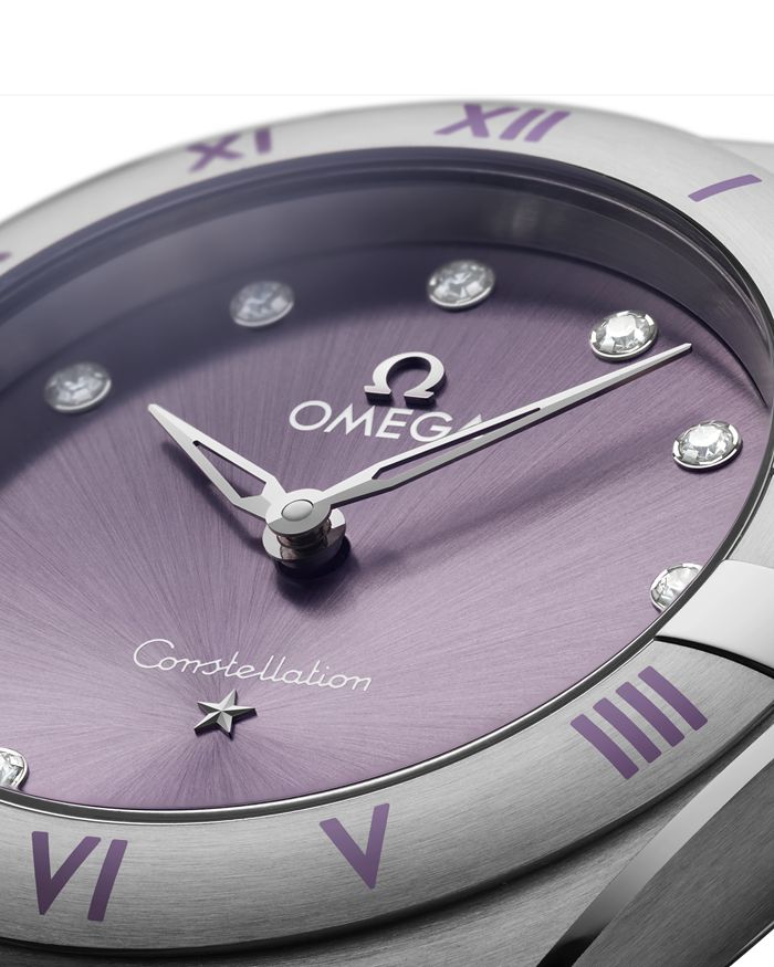 Para dar al bisel un toque extra de color, OMEGA ha resaltado con el mismo tono pastel los números romanos grabados.
