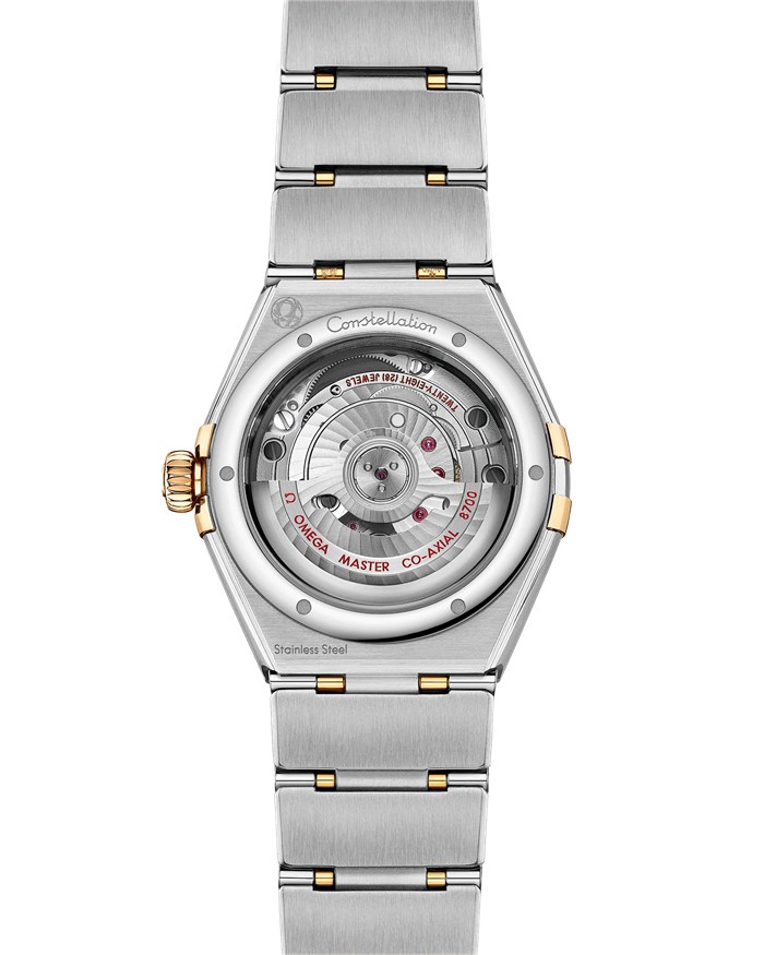 Este modelo de 29 mm en oro amarillo de 18 qt y acero noble luce un bisel con números romanos grabados, esfera plateada blanca cristalina con diamantes como índices horarios y una ventana de fecha situada a las 6 h. Las agujas, el logotipo OMEGA, la estrella Constellation y los engastes de los diamantes son también de oro amarillo de 18 qt.