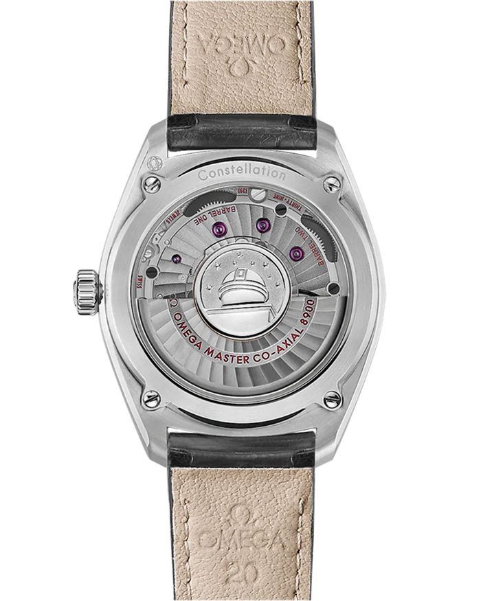 El fondo de caja lleva el medallón del Observatorio en acero noble. La esfera «Pie Pan» en plata opalina recuerda la del primer modelo Constellation de 1952.