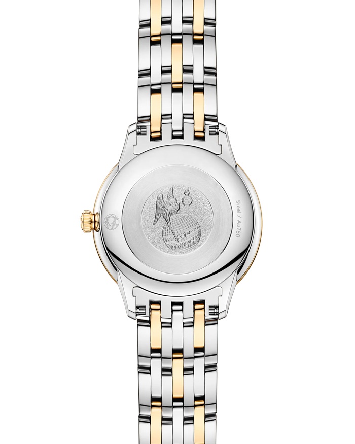 En este modelo de 27,5 mm elaborado con acero noble y oro amarillo de 18 qt, la esfera ha sido realizada con nácar blanco. La composición destaca por sus agujas bañadas en oro amarillo, así como por la alternancia entre los números romanos y los índices con cabujones engastados. El estilo depurado del reloj se completa con un fondo de caja con el medallón del dios Crono repujado.