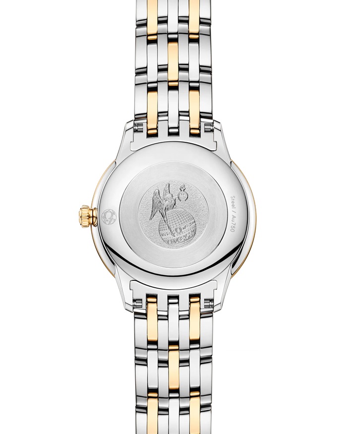 En este modelo de 27,5 mm elaborado con acero noble y oro amarillo de 18 qt, la esfera de oro Moonshine™ con revestimiento de PVD presenta un acabado de cepillado solar. La composición destaca por sus agujas bañadas en oro amarillo, así como por la alternancia entre los números romanos y los índices con cabujones engastados. El estilo depurado del reloj se completa con un fondo de caja con el medallón del dios Crono repujado.