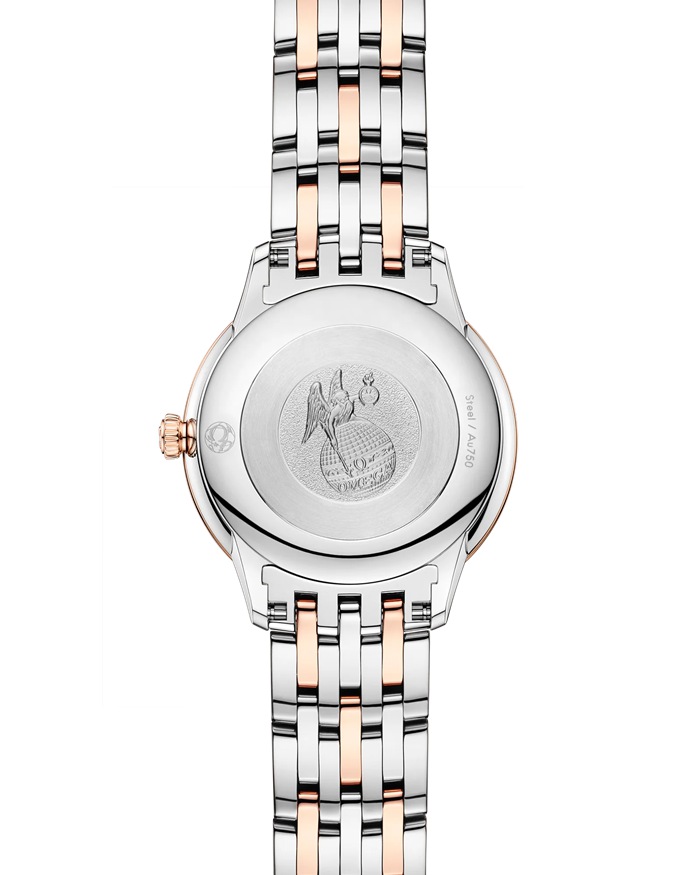En este modelo de 27,5 mm elaborado con acero noble y oro amarillo de 18 qt, la esfera plateada está estampada con un motivo vertical aleatorio con acabado de cepillado solar. La composición destaca por sus agujas de oro Sedna™ de color con revestimiento de PVD, así como por la alternancia entre los números romanos y los índices con cabujones engastados.El estilo depurado del reloj se completa con un fondo de caja con el medallón del dios Crono repujado.