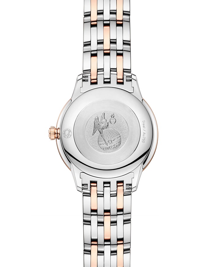 En este modelo de 27,5 mm elaborado con acero noble y oro Sedna™ de 18 qt, la esfera de PVD color lino presenta un acabado de cepillado solar. La composición destaca por sus agujas de oro Sedna™ de color con revestimiento de PVD, así como por la alternancia entre los números romanos y los índices con cabujones engastados. El estilo depurado del reloj se completa con un fondo de caja con el medallón del dios Crono repujado.