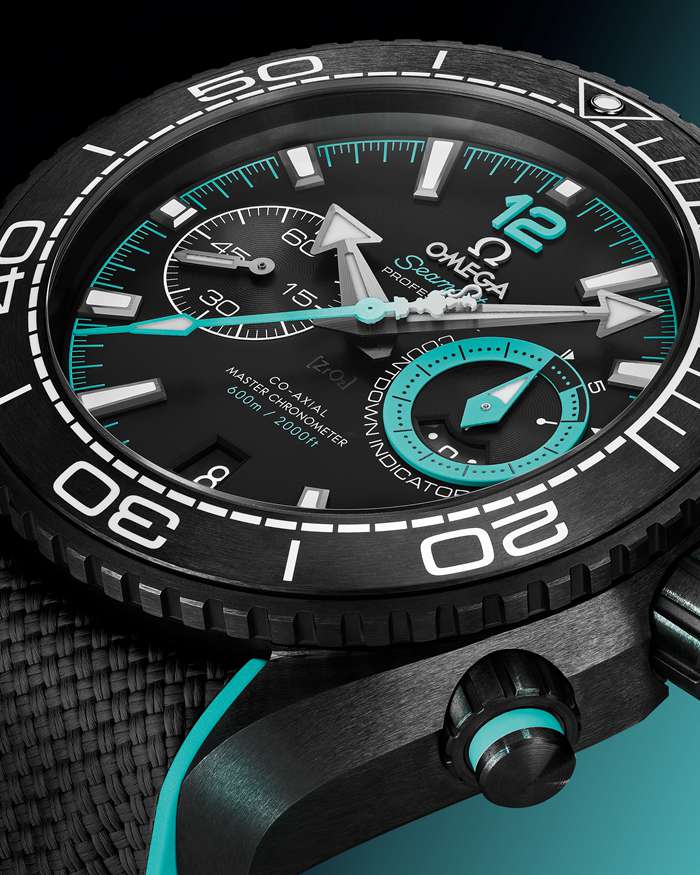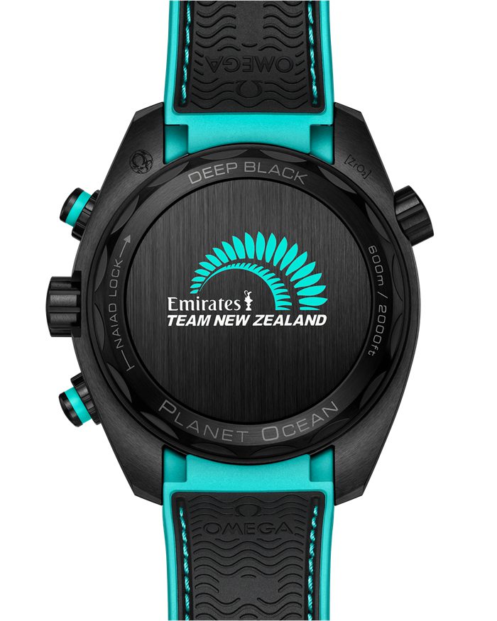 En la esfera de cerámica mate, OMEGA ha incluido un símbolo del protocolo previo a la regata con un INDICADOR DE CUENTA ATRÁS situado a las 3 h, con bandera de SALIDA. La aguja del indicador y el aro de la subesfera son de color turquesa con el logotipo ETNZ, junto con la escala de minutos, el número 12 y la aguja del segundero central de cronógrafo con el contrapeso del trofeo de la Copa América. OMEGA también ha incluido el color en los aros de los pulsadores de cerámica negra cepillada, el HE en la válvula de escape de helio y el logotipo OMEGA en la corona.