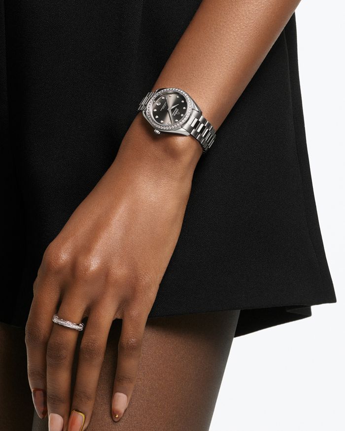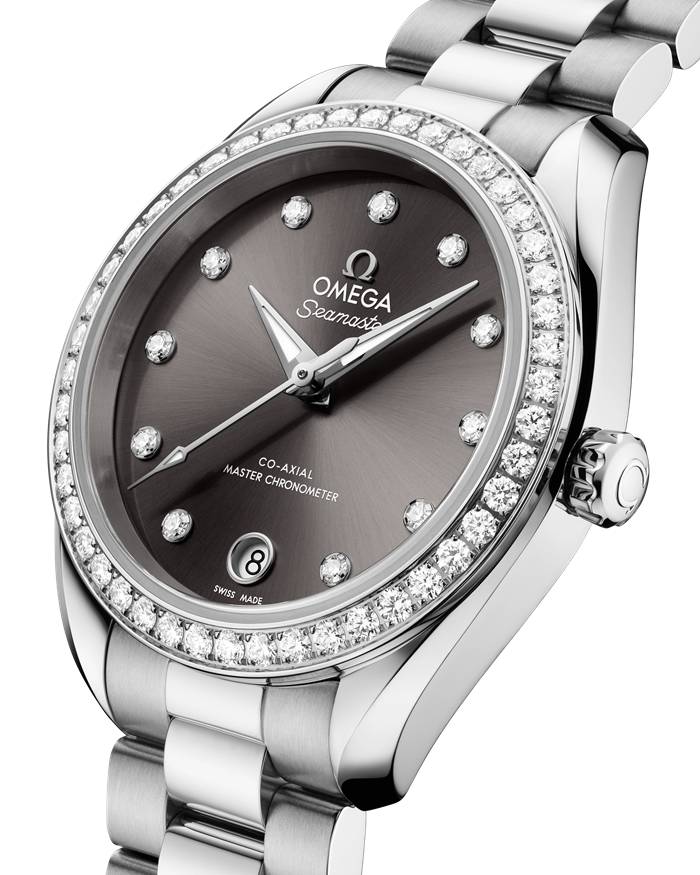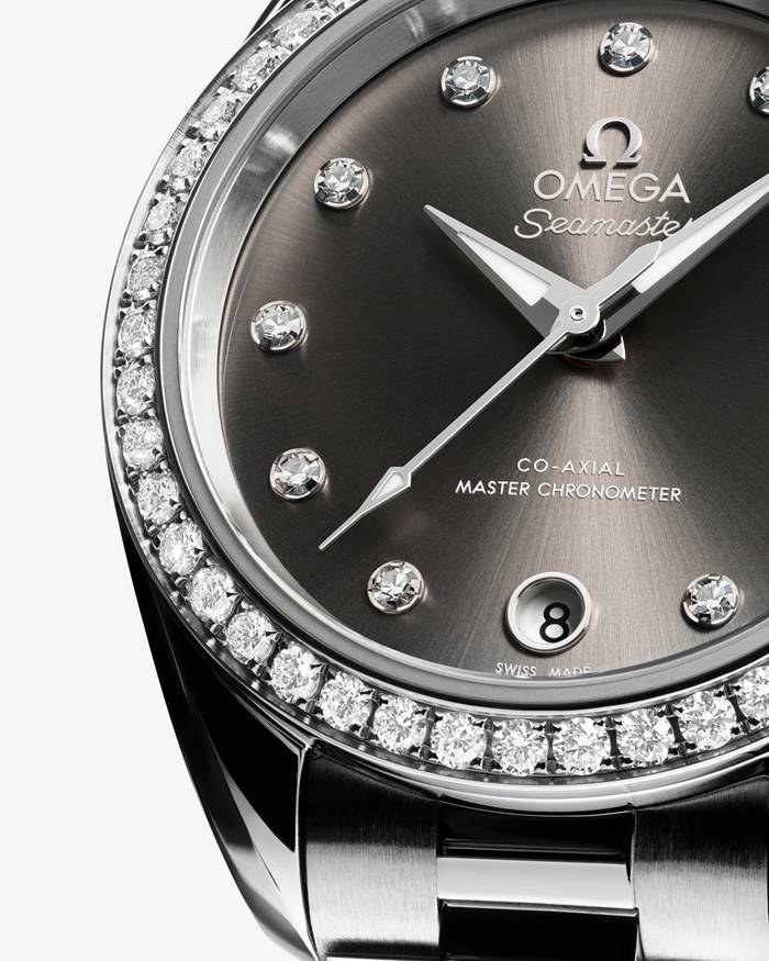 La esfera gris con cepillado solar está tratada en PVD y lacada y presenta una ventana de fecha circular situada a las 6 h. La realzan 11 índices horarios de diamante y agujas facetadas rediseñadas, con el minutero en disminución hasta un punto de formas delicadas. Todos los elementos aplicados y las agujas son de oro blanco de 18 qt, mientras que las agujas también están rellenas de Super-LumiNova blanca con resplandor azul.