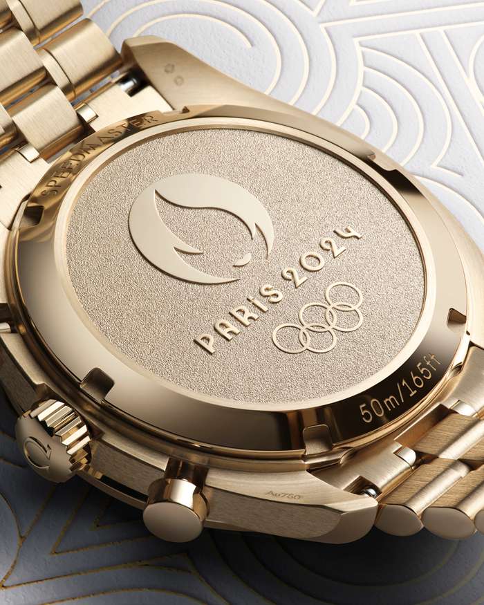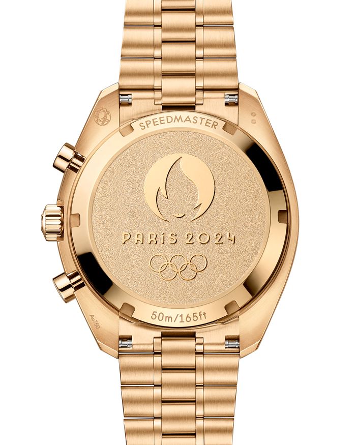 En la cara posterior, el fondo de caja conmemorativo en oro Moonshine™ de 18 qt lleva estampado un medallón con una base esmerilada que muestra un logotipo Paris 2024 pulido en espejo, con las palabras estampadas “Paris 2024” y los Aros Olímpicos.