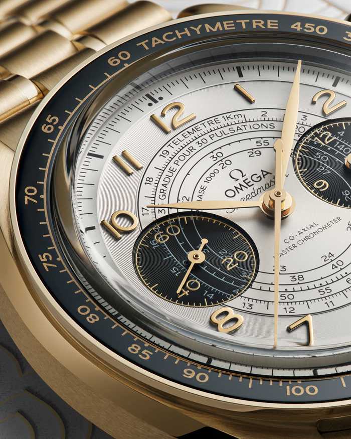 Este modelo de 43 mm rinde homenaje a los Juegos Olímpicos Paris 2024 y exhibe los tres colores principales de la competición: oro, negro y blanco. El reloj está realizado en oro Moonshine™ de 18 qt y presenta una esfera plateada opalina de color blanco y subesferas ennegrecidas. Otras de sus características son un aro de bisel cerámico de color negro con escala taquimétrica en OMEGA Ceragold™, números arábigos en oro Moonshine™ de 18 qt, agujas con forma de hoja y agujas de subesfera tratadas con PVD en oro Moonshine™.