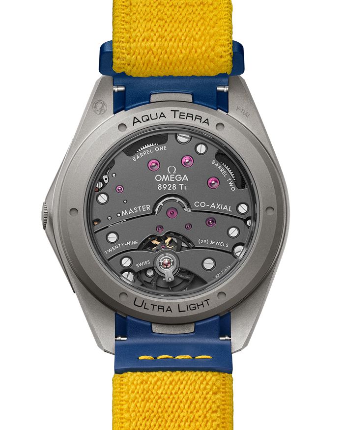Para la esfera anodizada azul, OMEGA ha utilizado titanio de grado5 pulido al chorro de arena y grabado con un motivo de barras horizontales. Al margen de los índices ennegrecidos y de la aguja horaria y el minutero de Super-LumiNova, el modelo presenta un segundero central cilíndrico perfilado con láser 3D, barnizado en amarillo e inspirado en el salto con pértiga.