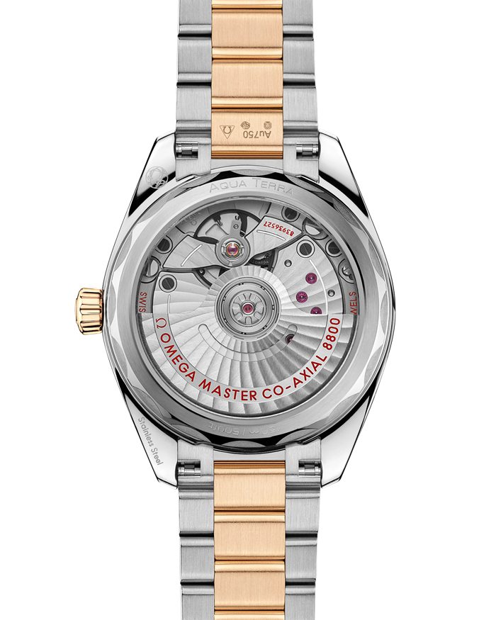 El Seamaster Aqua Terra constituye un fabuloso homenaje al rico legado marítimo de OMEGA. Este modelo de 34 mm posee una caja simétrica en acero noble y oro Moonshine™ de 18 qt con un fondo de caja atornillado de bordes ondulados.