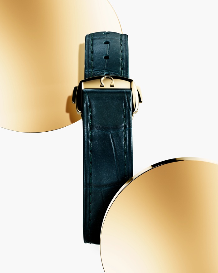 La esfera con cepillado solar y lacada está tratada con CVD y se presenta en color verde aguamarina, con una ventana circular aplicada de fecha en oro Moonshine™ de 18 qt y transferencias de color plateado. También se ha utilizado oro Moonshine™ de 18 qt para cubrir las agujas facetadas, así como para crear los índices horarios, que tienen forma de casco de velero y están rellenos de Super-LumiNova blanco.