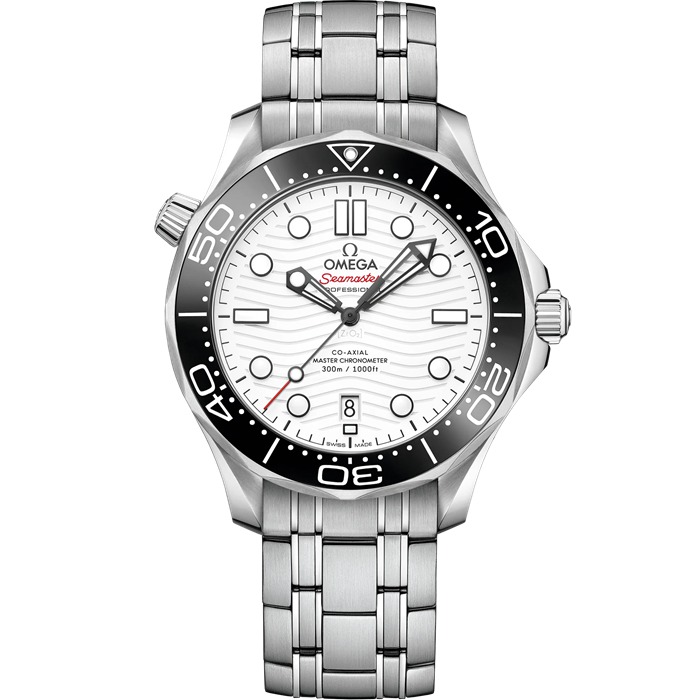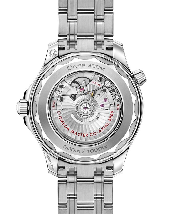 Este modelo de 42 mm está realizado en acero noble e incluye un bisel de cerámica negra con una escala de inmersión en esmalte blanco. La esfera es de cerámica blanca pulida y presenta, grabados por láser, ondas y Seamaster resaltado en rojo.