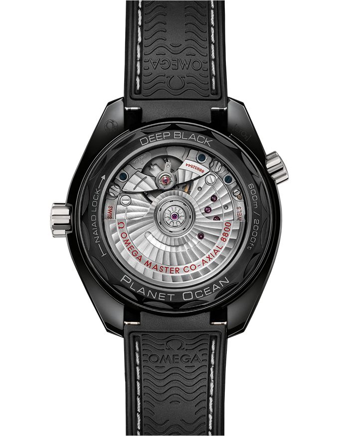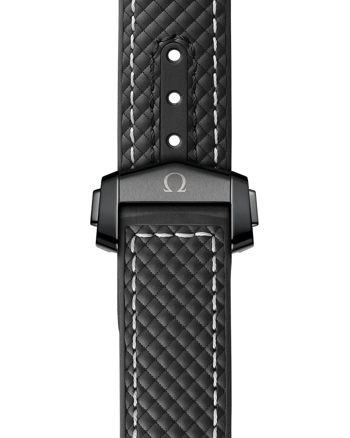 Este modelo de 39,5 mm luce caja y bisel en cerámica negra brillante, con escala de inmersión en esmalte blanco. La esfera es también de cerámica negra, con números, índices y agujas en oro blanco de 18 qt y una ventana de fecha situada a las 3.