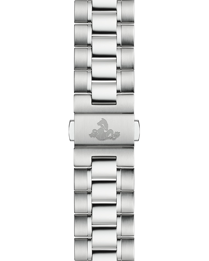 La caja y el bisel de este modelo son de acero noble. El bisel incluye una escala de taquímetro sobre un aro cerámico blanco.