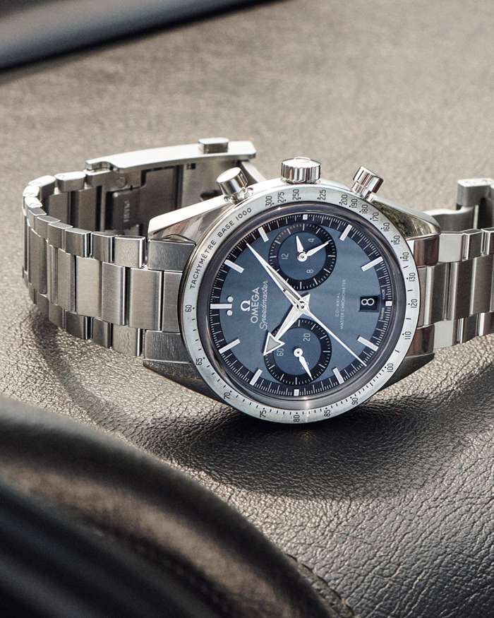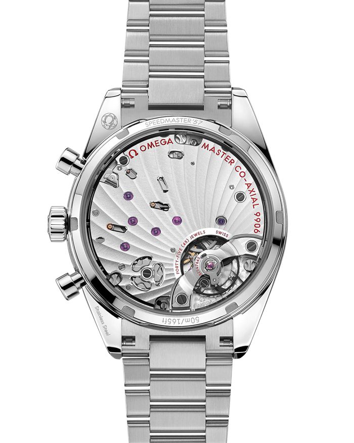 El bisel cepillado presenta una escala taquimétrica ennegrecida, mientras que el fondo de caja incluye un grabado “Speedmaster ‘57” y un cristal de zafiro plano con tratamiento antirreflejos en la cara interna.