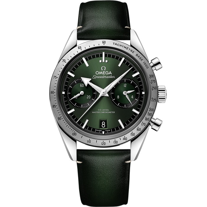 Este modelo de 40,50 mm, inspirado en el legendario diseño original de 1957, presenta una caja de acero noble con una esfera verde con índices horarios rodiados y agujas «Broad Arrow», ambos revestidos con Super-LumiNova blanco vintage. Hay una ventana de fecha situada a las 6, una subesfera de segundero a las 9, un contador de 60 minutos y otro de 12 horas en la subesfera de las 3.