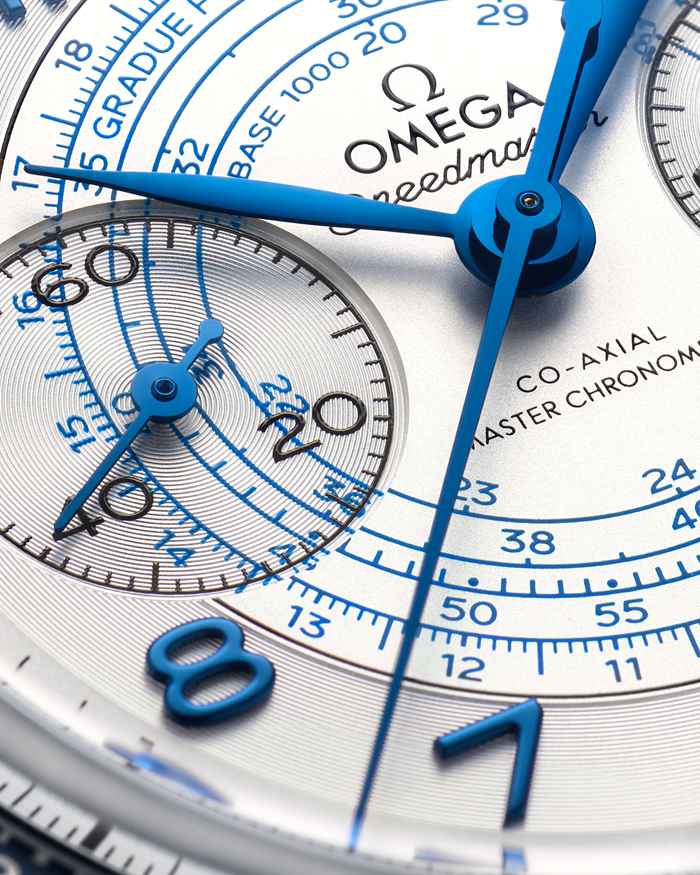 Este modelo de 43 mm está realizado en acero noble con esfera plateada. Junto con el aro de bisel en aluminio anodizado azul, con su escala taquimétrica, las agujas en forma de hoja y los números arábigos también son azulados, con un diseño exclusivo de pista «en espiral» que discurre bajo los números.