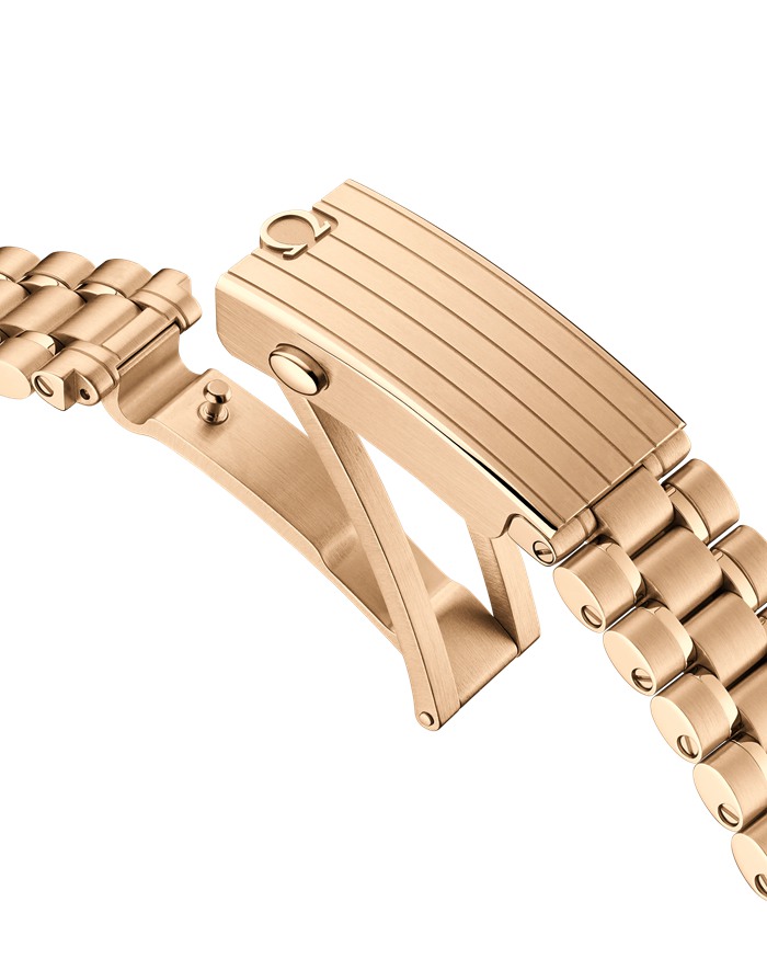 Este Moonwatch de 42 mm con caja y brazalete de oro Moonshine™ de 18 qt está inspirado en la 4.ª generación del Speedmaster, y cuenta con una esfera «escalonada» de oro Moonshine™ de 18 qt con cepillado solar y subesfera e índices ennegrecidos. El aro del bisel de cerámica negra con escala taquimétrica de OMEGA Ceragold™ incorpora la famosa marcación «Dot over 90».