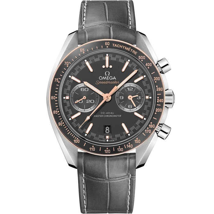 Presentado con una pulsera de piel gris, este modelo Speedmaster Racing Master Chronometer luce una caja de 44,25 mm en acero noble, con bisel en oro Sedna™ de 18 qt. El aro de bisel en nitruro de silicio incluye la famosa escala de taquímetro, en OMEGA Ceragold™.