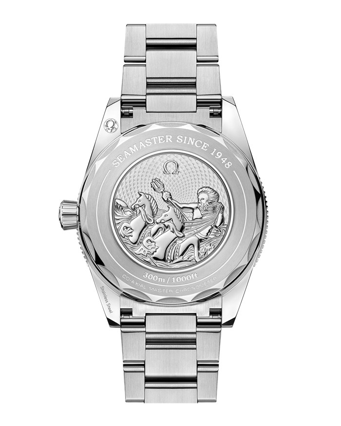 Este Seamaster 300 de 41 mm, con su caja simétrica de acero noble pulido y cepillado, tiene un brazalete a juego.