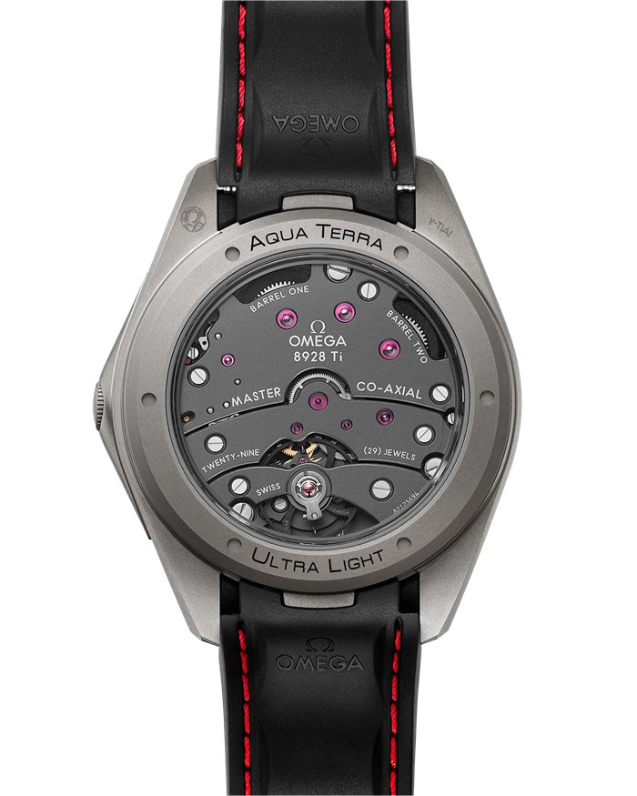 El reloj presenta una pulsera de caucho negro e incluye una esfera en titanio de grado 5 tratada al chorro de arena que a su vez presenta las barras del icónico Aqua Terra. El reloj pesa solamente 55 gramos cuando lleva la pulsera adicional de tejido deportivo.
